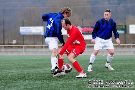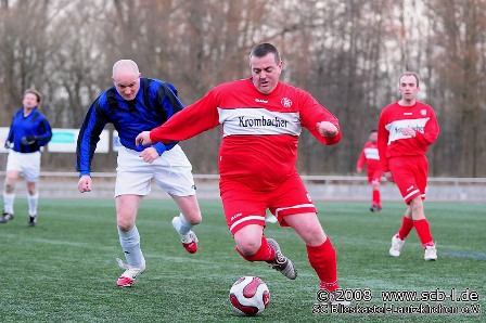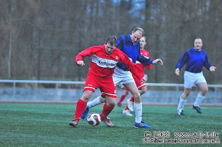 Die AH bleibt auch im dritten Spiel des Jahres 2008 ungeschlagen: In einem zunächst temporeichen Spiel hatte der SC von Beginn an mehr Ballbesitz vorzuweisen und konnte die Gäste bis auf einige wenige Ausnahmen vom eigenen Gehäuse fernhalten. Doch zunächst haperte es an der Chancenverwertung: Der Sc hatte in Person von Kurt Collett, Michael Pulver und Andreas Stutz hochkarätige Möglichkeiten scheiterte aber bis dahin am Gästekeeper, am Aluminium oder am eigenen Unvermögen. Der Lohn für die Bemühungen dann kurz vor der Pause: Ein Kopfballtor von Kurt Colett brachte dem SC endlich den überfälligen Führungstreffer. Mit dem 1:0 zu Gunsten der Hasuherren ging es dann auch in die Pause.