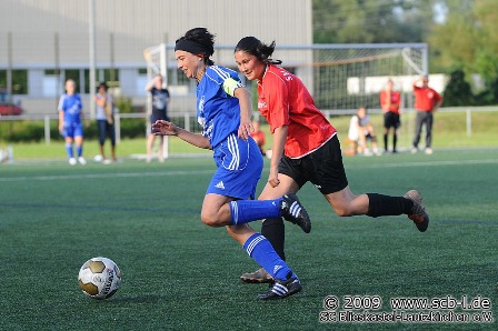 Am ersten Tag des Sportfestes des SC Blieskastel-Lautzkirchen e.V. bestritten die Frauen des SC ihr erstes Testspiel für die neue Bezirksliga-Saison 2009/2010. Der Gegner an diesem Freitag kam vom SV Kirrberg, der in der kommenden Saison in der 11er-Bezirksliga an den Start gehen wird. Von Beginn an entwickelte sich eine recht ausgeglichene Partie, in der zunächst der SC die besseren Karten auf seiner Seite hatte: Stefanie Schößer und Daniela Seegmüller kombinierten sich unterstützt von Katja von Gries ein ums andere Mal vor das Kirrberger Tor, ohne jedoch den konsequenten Abschluss zu finden. Es kam, wie man es bei den SC-Frauen schon zur Genüge kennt: Der erste nennenswerte Torschuss der Kirrbergerinnen auf das Tor von Desiree Bengel schlug ins Netz ein und wie so oft lag man zurück, obwohl man die Partie zuvor gut kontrolliert hatte. Eine Auswechslung in der Spitze ließ die Offensivaktionen des SC etwas abflachen, dennoch fand der SC in Person von Stefanie Schößer weiterhin über die rechte Außenbahn den Weg Richtung Strafraum, ohne jedoch Zählbares zu erreichen. Kirrberg profitierte von den langen Reaktionszeiten, den laschen Ballabgaben und unnötigen Fehlpässen seitens des SC im Mittelfeld und ließ sich nicht lange bitten: Der maximal dritte Torschuss des SVK in der ersten Hälfte landete erneut in den Maschen. Kirrbergs Nummer 9 entpuppte sich als echte, aber auch einzige Torgefahr, die es im Auge zu behalten galt. Trotzdem blieb der SC weiterhin zu brav: Ein einziges Foul in den ersten 40 Minuten und kaum körperlicher Einsatz waren einfach zu wenig, um sich Respekt zu verschaffen. Zur Pause blieb es beim 2:0 und beim SC musste man gewillter den Abschluss suchen, wollte man nicht mit einer Testspiel-Niederlage im Rücken in die neue Saison starten.