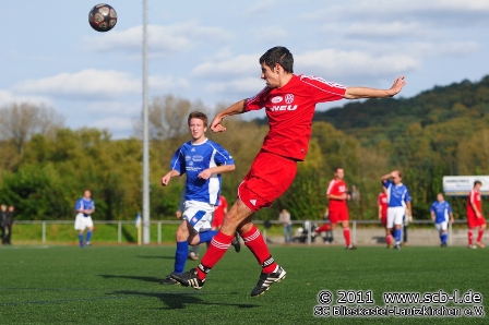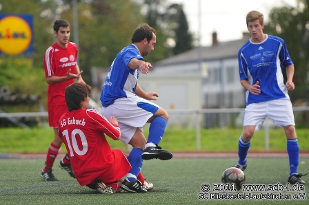 Die rund 100 Zuschauer an der Florianstraße sahen von Beginn an eine ereignisreiche Partie, in der Flavio Baier nach nur sieben Minuten einen der ersten SC-Angriffe zur 1:0-Führung für die Hausherren nutzte. Der SC hatte in dieser Phase gegen einen Gast der auf dem falschen Fuß erwischt schien etwas mehr vom Spiel, auch wenn Erbach stets gefährlich war und sich Abschlussmöglichkeiten erspielte. Der SC zeigte sich aber weitaus kaltschnäuziger als die Gäste und so war es nach 24 Minuten eine Moschel-Hereingabe, die Sven Sandmeyer über Umwege zum 2:0 im SGE-Tor unterbringen konnte. Erbach kam aber in die Partie zurück und spürte, dass auch die Hausherren alles andere als sicher in der Defensive standen. So witterte die SGE trotz 0:2-Rückstand ihre Chance. Nur vier Minuten nach dem 2:0 vergab Erbach aus dem Gewühl im SC-Strafraum die große Chance zum Anschluss, ehe der SC auf der Gegenseite eine Doppelchance vorzuweisen hatte: Erbach klärte eine Baier-Hereingabe in höchster Not, ehe Frederik Reuschl im SG-Tor einen Linn-Volley aus spitzem Winkel parierte. Auch ein Moschel-Drehschuss verfehlte das SG-Tor nur knapp. In der Defensive zeigten sich die Hausherren aber weiter unkonzentriert und so kam es, dass Jonathan Haas das Leder aus dem Gewühl heraus zum 1:2-Anschlusstor über Linie drückte. Erbach drückte nun auf den Ausgleich, der angeknockte SC rettete sich aber mit dem 1:2 in die Pause.
