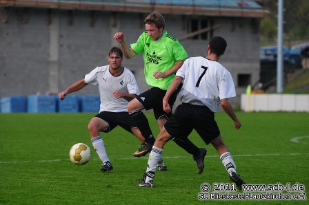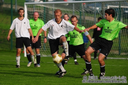 Wie schon vor Wochenfrist sahen die rund 100 Fußballfans in Rubenheim einen Blitzstart des SC Blieskastel-Lautzkirchen: Nach nur sieben Minuten wurde ein Stumpf-Freistoß von der Mauer abgelenkt und Sebastian Kiefer war zu Stelle um zur frühen SC-Führung einzuschieben. Die Hausherren schienen schockiert von der frühen SC-Führung und so konnte Pascal Linn nur 180 Sekunden später David Gentes in Szene setzen, der die SC-Führung auf 2:0 ausbaute. Zuletzt hatte der SC selten mit 2:0 in Rubenheim geführt, es deutete sich aber bereits jetzt an, dass diese Partie keinesfalls schon entschieden war. Nach 15 Minuten sorgte erstmals der Unparteiische Ralf Pfeiffer für Aufregung, zeigte er doch im SC-Strafraum auf den berüchtigten Punkt. TuS-Keeper Thomas Fromm eilte zur Tat, scheiterte aber an SC-Keeper Felix Bastian, der sich in der Folge bei einem Zusammenprall am Ellenbogen so schwer verletzte, dass der gegen Ersatzkeeper Christian Geble ausgewechselt werden musste. Die Partie wurde nun immer ruppiger und fast minütlich durch größere und kleinere Fouls unterbrochen. So kam wenig Spielfluss auf und auch wenn die Hausherren nun mehr Ballbesitz zu bieten hatten, fehlte den Aktionen des TuS die nötige Konsequenz. Die größten Chancen in der Schlussphase der ersten Halbzeit hatte aber der Gast aus Blieskastel-Lautzkirchen: Nach 32 Minuten wurde zunächst ein Moschel-Schuss im Strafraum geblockt, ehe Pascal Linn im Nachschuss nur den Pfosten traf. Nur wenig später setzte Moschel Daniel Rudolph in Szene, der vollkommen frei im TuS-Strafraum verzieht. Auf der anderen Seite sorgte ein Drehschuss von Michael Riedschy für Gefahr, ehe mit einer 2:0-Gästeführung die Seiten gewechselt wurden.