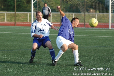 Von der ersten Minute an ließ unsere AH keinen Zweifel daran, dass man das Spiel gewinnen wollte. Kirkel begann sehr defensiv und verlegte sich aufs kontern. Blieskastel startete einen Angriff nach dem anderen, tat sich jedoch schwer gegen die dicht gestaffelte Abwehr seinen Stürmer in eine gute Schußposition zu bringen. Die wenigen Angriffsbemühungen des SV endeten zumeist 20 Meter hinter der Mittellinie. Nach 25 Minuten war es dann unser Geburtstagskind Michael Striegel (Alter ???) der das längst fällige und erlösende 1:0 erziehlte. Bis zu Pause hatte man noch einige gute Chancen scheiterte jedoch immer wieder am gut aufgelegten Kirkeler Torhüter.