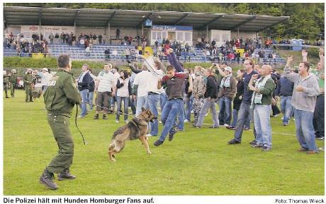 „Polizisten wurden nicht verletzt. Es wurde niemand festgenommen“, sagt Polizeihauptkonmissar und Einsatzleiter Werner Sick. Er erklärt: „Beide Fanlager sind verfeindet, insgesamt waren mehr als 200 Polizisten und Ordner im Einsatz.“ Die Ordner hatten die Randalierer, die Sicherheitsschlösser an den Toren zum Spielfeld zerstörten und so in den Innenraum kamen, nicht aufhalten können. Ein Ordner musste ins Krankenhaus. Er hatte sich die Hand aufgerissen, als er versuchte, sich gegen das Öffnen eines Tores zu stemmen.