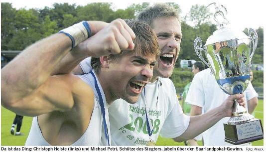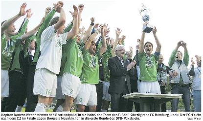 Siegtorschütze Petri war nach seinem Tor nicht mehr zu halten. „Wir wussten, dass es sehr schwer wird“, sagte Petri und gab zu: „Nach dem 1:1 war Neunkirchen mehr am Drücker. Wir haben zeitweise Glück gehabt. Aber völlig egal. Hauptsache, wir haben das Ding.“ Das Finale war keine spielerisch gute Partie, darüber waren sich auch als Zuschauer anwesende Trainer wie Norbert Groß oder Alfred Kaminski vom 1. FC Saarbrücken einig. „Dafür ist es, wie zu erwarten war, sehr kampfbetont. Es geht ja auch um viel“, meinte Kaminski. Der FC Homburg kann mit den Einnahmen aus der ersten Runde des DFB-Pokals jetzt seinen Etat für die kommende Spielzeit aufbessern. Pokaltermin ist das Wochenende des 9./10. August, die Auslosung ist am 6. Juli um 16 Uhr (live auf Premiere).