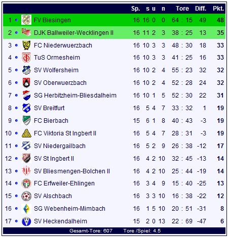 Nächste Woche geht es dann mit dem vorletzten Spieltag im Jahr 2010 weiter: Die DJK Ballweiler-Wecklingen II empfängt den SV Alschbach und der SV Oberwürzbach empfängt den FC Bierbach, während der Spitzenreiter aus Biesingen spielfrei zuschauen muss: