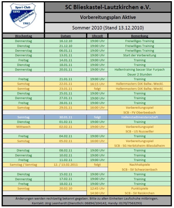 Das Jubiläumsjahr 2010 des SC Blieskastel-Lautzkirchen geht zu Ende, die Vorbereitung auf das neue Jahr 2011 wird aber schon bald beginnen: Am 13. Januar des Jahres 2011 geht es los, dann beginnt die Vorbereitung des SC, in der insgesamt drei Vorbereitungsspiele und zwei Hallenturniere auf dem Terminkalender stehen.