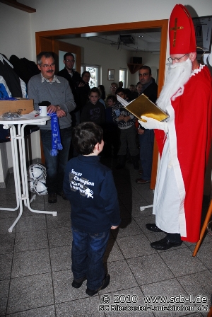 Auch am Samstag hatte die Jugendabteilung volles Programm zu bieten: Ab 14:00 Uhr waren es die Nachwuchskicker der F- und G-Jugend, die ihre Weihnachtsfeier zelebrierten. Natürlich durfte gerade bei den Kleinsten der Weihnachtsmann nicht fehlen. Und während SC-Vorstand Günter Pusse den Weg für den Schlitten den Nikolaus freischippte gab es im Sportheim die Bescherung. Der Weihnachtsmann enthüllte dabei einige Anekdoten aus dem Alltag der SC-Nachwuchsspieler und beschenkte diese reichlich.