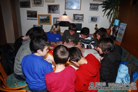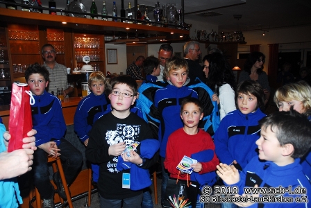 Der SC Blieskastel-Lautzkirchen hat viele Traditionen, zu den schönsten und am stärksten frequentierten im Kalenderjahr zählt aber seit Jahrzehnten ein Highlight unmittelbar vor dem Weihnachtsfest. Die Jugendweihnachtsfeiern standen auf im Jubiläumsjahr 2010 ganz fett im Terminkalender der SC-Jugendlichen und deren Eltern und wie immer ging es am Wochenende vor dem Weihnachtsfest im SC-Sportheim hoch her. In der vergangenen Woche feierte bereits die A-Jugend beim gemütlichen Beisammensein ihren vorweihnachtlichen Jahresabschluss, auch die B-Mädchen gingen auf große Reise in die Eishalle und danach ins SC-Sportheim ehe am Wochenende die jüngeren Jahrgänge auf ihre Kosten kamen. Schon am Freitag stand die Weihnachtsfeier der D-Jugend auf dem Programm, die sich zahlreich im SC-Sportheim versammelte und bei winterlichen Witterungsverhältnissen einen tollen Jahresabschluss feierte. Dass dabei die Schneeballschlacht auf dem verschneiten Kunstrasen des SC nicht fehlen durfte ist Ehrensache. Auch das beliebte Weihnachtsfeierquiz durfte dabei natürlich nicht fehlen.