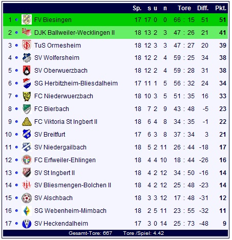 Ein Blick auf die gesammelten Ergebnisse zeigt, dass das Top-Quintett aus Biesingen, Ballweiler-Wecklingen, Ormesheim, Wolfersheim und Oberwürzbach siegreich blieb und damit den Kampf um den Aufstieg unter sich auszumachen scheint.