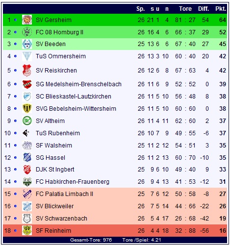 Durch den 6:1-Auswärtserfolg beim Lokalrivalen kann der SV Gersheim Profit aus der Niederlage des FC 08 Homburg II gegen den SV Beeden schlagen und seine Tabellenführung vier Spieltage vor dem Ende auf scheinbar uneinholbare 12 Punkte ausbauen. Reinheim dagegen kommt der Kreisliga immer näher und rangiert mit 16 Punkten schon drei Punkte hinter dem SV Schwarzenbach auf Rang 18 der Tabelle.