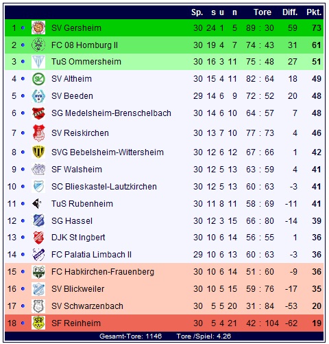 Der SV Gersheim kann also durch den Heimerfolg gegen die DJK St. Ingbert den Titelgewinn frühzeitig so gut wie perfekt machen, nur noch eine theoretische Chance auf ein Entscheidungsspiel sorgt für einen kleinen Zwiefel. Wohingegen der SV Schwarzenbach und die Sportfreunde aus Reinheim auf ein Homburger Relegationswunder hoffen müssen: