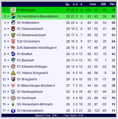 In der Tabelle schmilzt der Vorsprung des FV Biesingen auf sechs Punkte zusammen. Im Kampf um Relegationsrang zwei schenken sich Herbitzheim-Bliesdalheim und Wolfersheim nichts und liefern sich ein Rennen, das bis auf die Ziellinie spannend sein wird:
