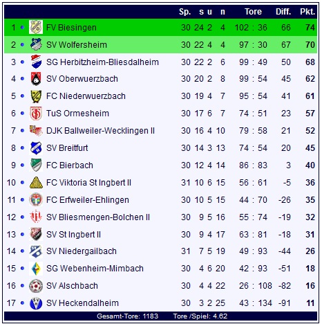 In der Tabelle schmilzt der Vorsprung des FV Biesingen weiter. Auf Platz zwei kommt es dagegen zum Platztausch: Wolfersheim übernimmt nach dem 5:0-Sieg im direkten Duell mit der SG Herbitzheim-Bliesdalheim den Relegationsplatz von der SG: