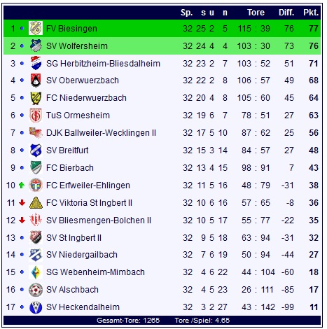 Am Ende war es der TuS Ormesheim, der wie schon sooft in dieser Saison jubeln durfte: Durch einen 1:0-Heimerfolg gegen die SG Herbitzheim-Bliesdalheim bessert der TuS Ormesheim sein Punktekonto auf 63 Punkte auf und schließt die Saison auf Rang sechs ab. Die SG Herbitzheim-Bliesdalheim dagegen macht ihre Hausaufgaben nicht um auf einen Wölfe-Ausrutscher hoffen zu dürfen. Das die Wölfe aber ihr Spiel ohnehin gewannen ist die Auswärtsniederlage am Ende fast bedeutungslos. Die SG schließt die Saison mit 71 Punkten auf Rang drei ab.