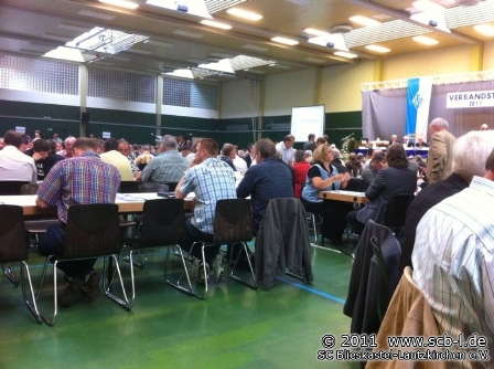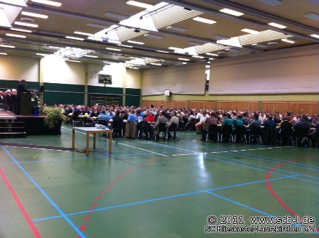 Alle drei Jahre ist es so weit: Im Saarland ist Verbandstag-Zeit. Erneut in Püttlingen trafen sich am Samstag, den 18. Juni 2011 rund 1.000 Vereins- und Verbandsfunktionäre, um die Weichen für die nächsten Jahre beim Saarländischen Fußball-Verband zu stellen und gleich zu Beginn war im Püttlinger Trimm-Treff eine spezielle Stimmung zu spüren: Es wurde viel diskutiert und eine Mischung aus Gespanntheit und Unzufriedenheit über viele Eindrücke der jüngsten Vergangenheit bestimmten das Bild in der prall gefüllten Turnhalle in Püttlingen. Um 9:13 Uhr ging es dann los: Verbandspräsident Franz Josef Schumann eröffnete den Ordentlichen Verbandstag des Saarländischen Fußball Verbandes 2011. Schumann begrüßte den Anwesenden, besonders die vielen Ehrengäste aus Sport und Politik, die den Weg zum Verbandstag gefunden hatten. 478 Stimmberechtigte wurden festgestellt und vertraten die insgesamt 110.475 Mitglieder des SFV. Die Mitgliederzahl war in den letzten drei Jahren um rund 5000 zurück gegangen, lediglich die Zahl der weiblichen Mitglieder stieg um 500 auf 15.500. Auch die Zahl der Vereine stieg auf 396, davon nehmen 352 am Spielbetrieb teil. Die anwachsende Vereinszahl führte Schumann nicht nur auf die Aufnahme der Tischfußballer in den SFV zurück.