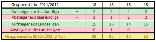 Zur Saison 2012/2012 wird es eine neue Klassenstruktur im SFV-Gebiet geben. Nach vielen anderen Versuchen wird es wieder eine Pyramidenstruktur geben, will heißen, die Anzahl der Spielklassen soll von oben nach unten zunehmen, auch die Zahl der Mannschaften wurde in allen Ligen, die Saarlandliga ausgenommen, auf 16 reduziert. Das sorgt für folgende Klassenstruktur ab der Saison 2012/2013:
