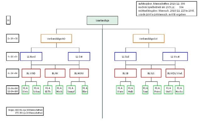 Könnte in der Bezirksliga Saarlouis ein Tabellenzweiter, -dritter usw. in die Landesliga aufsteigen, die ihm zugeteilte Liga hat jedoch schon die Höchstzahl von 16 erreicht, so kann er auch schriftlich erklären, in die Landesliga Süd bzw. West aufsteigen zu wollen und auch dort zu verbleiben. Gibt er diese Erklärung nicht ab, verliert er sein Aufstiegsrecht.