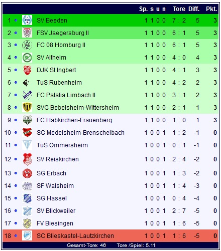 Die erste Tabelle der neuen Bezirksliga-Saison steht damit: Der erste Spitzenreiter der Saison kommt aus Beeden. Noch ist die Tabelle aber alles andere als aussagekräftig, geht es doch schon unter Woche um die nächsten Punkte, die zu großen Verschiebungen führen können: