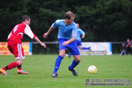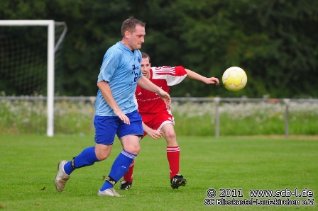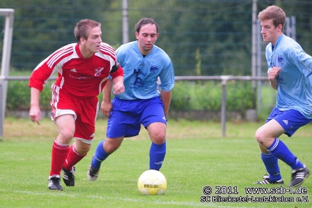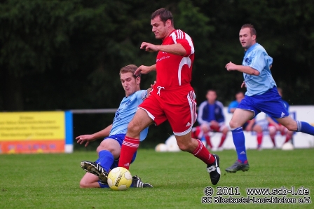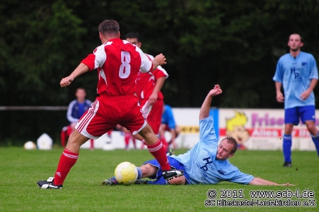 Das Derby in Blickweiler begann zunächst mit Feldvorteilen und einem Chancenplus der Gäste aus Blieskastel-Lautzkirchen. In einem gewohnt emotionsgeladenen Spiel hatte der SC die besseren Einschussmöglichkeiten und durfte erstmals jubeln, als David Gentes nach 20 gespielten Minuten per Kopf zum 1:0 traf. Nach und nach kamen auch die Hausherren besser ins Spiel, der SC vergab aber die große Chance zum 2:0, als Peter Pusse freistehend an Benjamin Hamman im SVB-Tor scheiterte. Im Gegenzug war es einmal mehr eine seltsame Raumaufteilung des SC verbunden mit einem unbedachten Einsteigen im Strafraum, dass für einen berechtigten Elfmeter für den SV Blickweiler sorgte. SVB-Spielertrainer Marek Wosnitza trat an und verwandelte nach 32 Minuten zum 1:1-Ausgleich. In der Folge glich das Offensivspiel des SC doch stark dem am Sonntag gegen den FC 08 Homburg II. Zwar präsentierte der SC viel Ballbesitz, konnte aber eigentlich fast nie in die gefährliche Region vor dem SVB-Tor vordingen. Zu leicht auszumalen waren die SC-Angriffe. In der Defensive stand man dagegen zumeist sicher, ein ums andere Mal wurde es dennoch kritisch und so rettet nur der Pfosten vor dem Rückstand. Mittlerweile hatte sich in Blickweiler ein munteres Derby entwickelt, dass sich zwar nicht auf höchsten spielerischem und taktischen Niveau abspielte, aber aufgrund des Engagements beider Teams einen gewissen Reiz hatte. Bis zur Pause blieb es beim 1:1-Remis.