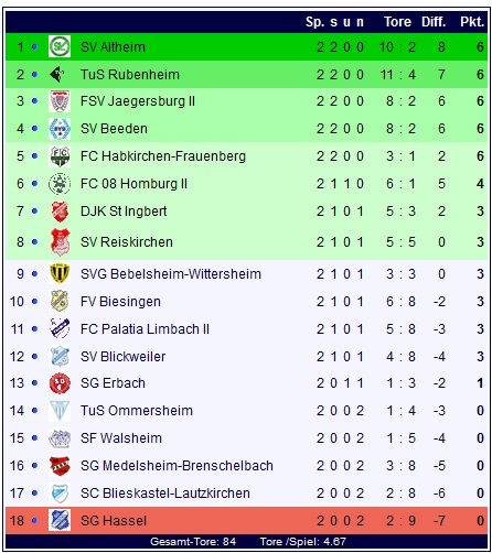 Die Tabelle gibt am zweiten Spieltag naturgemäß noch kein aussagekräftiges Bild ab, Altheim übernimmt die Spitze, Hassel ist das neue Schlusslicht: