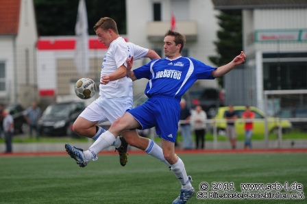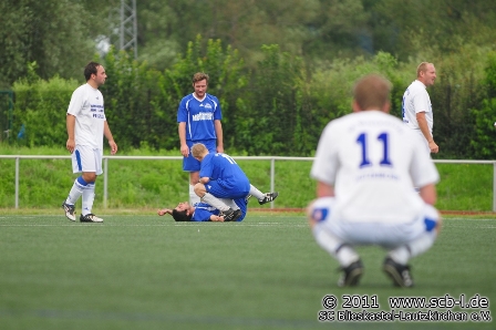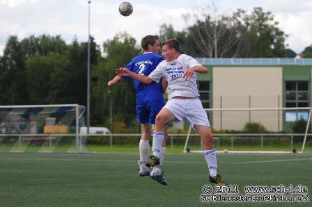 Die rund 80 Fußballfans an der Florianstraße sahen zunächst ein Spiel, das sich überwiegend im Mittelfeld abspielte, bei dem aber die Hausherren aus Blieskastel-Lautzkirchen ein deutliches Plus an Ballbesitz vorzuweisen hatten. Nach 18 Minuten war es David Gentes, der mit einem Fernschuss nur das Außennetz traf, ehe drei Minuten später Peter Pusse am Gästekeeper Florian Klein scheiterte. Der SC war nun klar am Drücker, aber auch Patrick Stumpf und Kapitän Peter Pusse konnten den Ball bei weiteren Chancen nicht im Tor unterbringen. So unglücklich und wenig zielstrebig der SC in der Offensive agierte, so kaltschnäuzig und treffsicher zeigten sich die Gäste, die bis dahin nur durch einige Gegenstöße für Offensivaktionen sorgten. Nach 29 Minuten war es ein Flankenfreistoß, der in der kurzen Ecke des SC-Tores landete und somit für die etwas schmeichelhafte SFW-Führung sorgte. Irgendwie passte das kuriose erste Tor aber zum Spiel. Walsheim tankte durch die überraschende Führung sichtlich Selbstvertrauen und nutzte nach 40 Minuten einen erneuten SC-Blackout in der Defensive zum 2:0. Auch hier warteten bis auf Torschütze Sebastian Halter alle Akteure kurioserweise auf einen Pfiff des Unparteiischen, die einen auf einen Elfmeterpfiff, die anderen auf einen Abseitspfiff. Walsheim hatte den SC mit einem Doppelschlag kalt erwischt und für die Gäste bot sich sogar die Großchance zum 3:0, als SFW-Rückkehrer Alain Hassli alleine auf Harder zustürmend einen Lupfer nicht platzieren kann. So blieb es zur Pause bei einem 2:0 für die Gäste, das aber aufgrund des Spielverlaufs der Anfangsphase ein wenig überraschend kam.