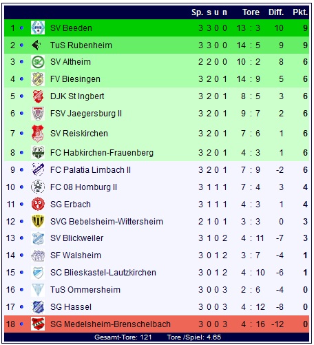 Die Tabelle nach dem dritten Spieltag und nach der englischen Woche zum Saisonstart zeigt mit dem SV Beeden einen neuen Spitzenreiter, dahinter lauert Rubenheim, ebenfalls mit weißer Weste und Altheim, das im Nachholspiel unter der Woche bei der SVG Bebelsheim-Wittersheim wieder an die Spitze der Tabelle vorstoßen kann: