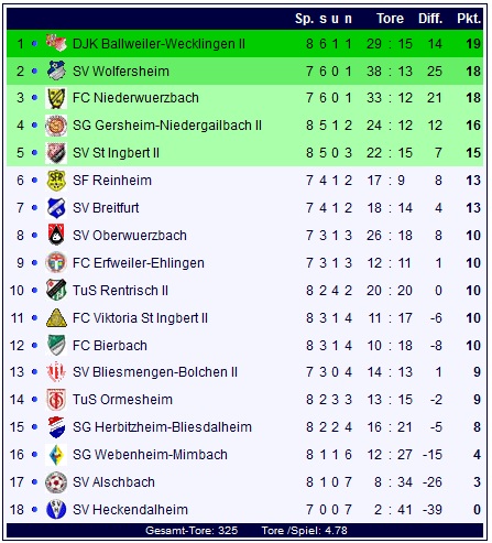 Durch den knappen Heimerfolg und einige Spielabbrüche erobert die DJK Ballweiler-Wecklingen II mit 19 Punkten die Tabellenspitze der Kreisliga A Bliestal. Der TuS steht mit neun Punkten auf Rang 14 der Tabelle.