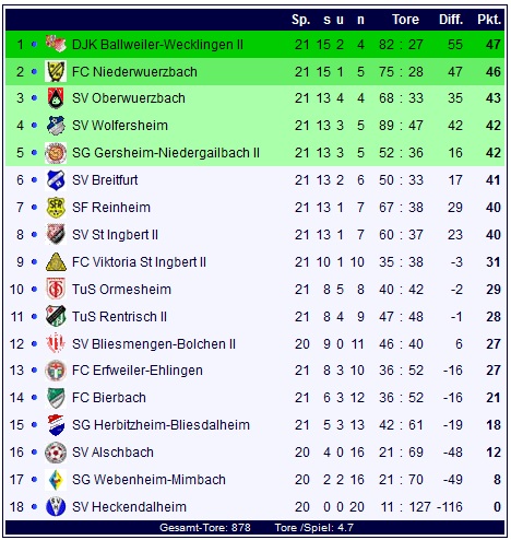 Der TuS Ormesheim sorgt mit einem 1:0-Auswärtssieg beim Spitzenreiter aus Niederwürzbach für einen erneuten Wechsel an der Spitzenposition: Niederwürzbach steht mit 46 Punkten hinter der DJK-Reserve aus Ballweiler-Wecklingen auf Rang zwei der Tabelle und verspielte die Wintermeisterschaft. Ormesheim steht mit 29 Zählern auf Rang neun.