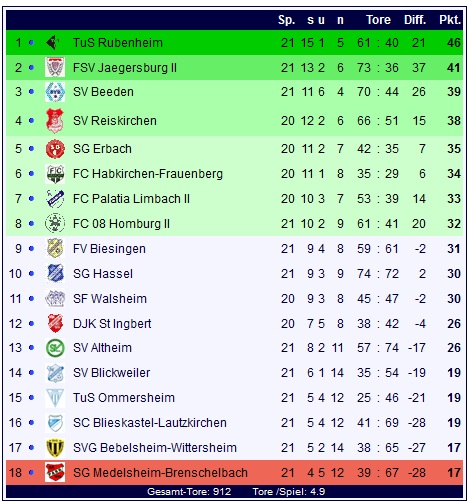 Am Ende kann die SVG Bebelsheim-Wittersheim ihre jüngste Erfolgsserie fortsetzen und macht im Samstagsspiel ihre Hausaufgaben: Ein überraschender 3:2-Heimerfolg gegen den einstigen Spitzenreiter aus Reiskirchen sorgt dafür, dass die SVG über Nacht die rote Laterne an den SC Blieskastel-Lautzkirchen, die SG Mddelsheim-Brenschelbach und den TuS Ommersheim abgibt. Alle drei haben 16 Punkte auf dem Konto, während die SVG mit 17 Punkten auf Rang 15 steht. Nur wenn alle drei Letzten gewinnen, würde die SVG also auf einem Abstiegsplatz überwintern. Der SV Reiskirchen dagegen bleibt bei 38 Punkten stehen und wird auf Rang drei postiert besonders gespannt auf die Ergebnisse der Konkurrenz blicken.