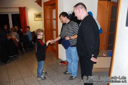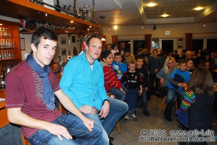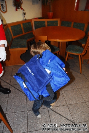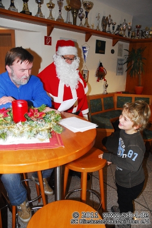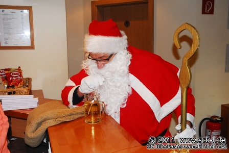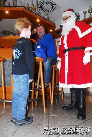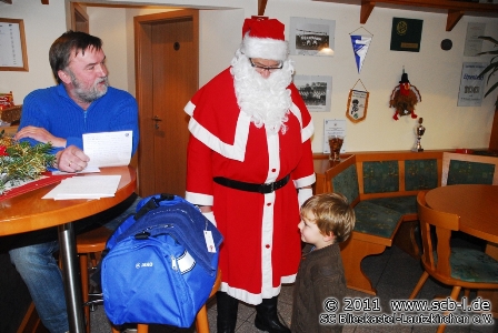 Weiter ging es dann am Samstag, an dem rund 60 der insgesamt 200 SC-Nachwuchskicker den Weg ins Sportheim finden sollten um ihren Jahresabschluss zu feiern. Den Anfang machte am Mittag die G-Jugend des SC, die in den letzten Wochen ihre Spieleranzahl fast verdreifacht hatte und so konnten die Trainer Burkhardt Speer und Norbert Sommer zahlreiche neue Kicker an der Florianstraße begrüßen. Natürlich durfte bei den Kleinsten im SC-Dress auch der Nickolaus nicht fehlen und der hatte einen vollen Sack Geschenke mitgebracht. Zum Einen gab es von der Jugendabteilung des SC hochwertig mit Vereinsnamen bestickte Handtücher, zum Anderen von Gönner Helmut Klein nagelneue Trainingsanzüge und von einem weiteren Freund SC-Jugend Michael Hohenstein neue Sporttaschen und Trainingsleibchen. Dass die G-Jugendlichen noch gehörigen Respekt vor dem bärtigen Mann in Rot-weiß mitbrachten war kein Hindernis und so blieb die Stimmung bei Kids und Eltern perfekt und jeder freute sich über einen tollen Nachmittag an der Florianstraße und einen gelungenen Abschluss des SC-Jahres 2011. Die erste Weihnachtsfeier für die vielen neuen SC-Kicker würde aber sicherlich nicht deren letzte sein!