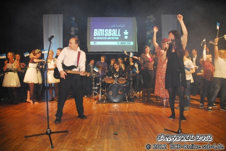 Da man das Finale dieses Jahr etwas fetziger gestalten wollte, ließen sich die Moderatoren von einem anderen Großereignis inspirieren, dem Eurovision Song Contest 2011 in Düsseldorf. Nach der offiziellen Verabschiedung und dem obligatorischen Dank an alle Mitwirkenden und Techniker rockten zunächst nur die Moderatoren sowie Se Gollies Schlagzeuger Marco Hartmann zum Song "Satellite" in der Rockabilly Version die Bühne. Als dann alle Akteure mit blau-weißen Fähnchen auf die Bühne strömten und schließlich auch Lena Meyer-Landrut alias Matthias Schößer auftauchte war dies ein perfekter Abschluss des Bimsballs 2012. Mit einem bunten Feuerwerk - im wahrsten Sinne des Wortes - verabschiedeten sich die Akteure. Für immer? Oder bis 2013? Wir werden es sehen. Die Fotos vom Bimsball 2012 gibt es unter dem Link unten...