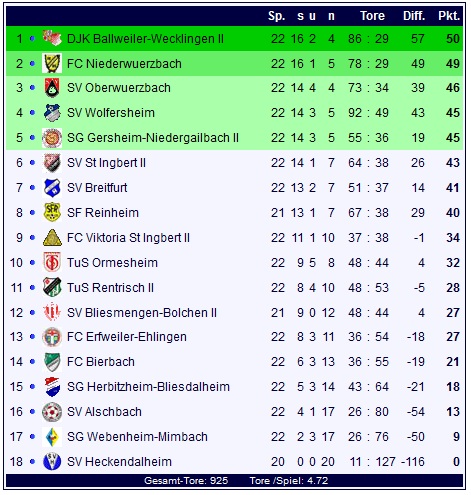 Auch der derzeit führungslose FC Niederwürzbach startet mit einem Sieg ins neue Jahr und gewinnt bei der SG Herbitzheim-Bliesdalheim mit 3:1. Durch den Sieg bleibt der FCN der DJK Ballweiler-Wecklingen II auf den Fersen und steht mit 49 Zählern einen Punkt hinter der DJK auf Rang zwei der Tabelle. Die SG dagegen bleibt als Vorjahresdritter mit 18 Punkten auf einem enttäuschenden 15tenh Tabellenplatz.