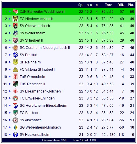 In der Tabelle rückt die Spitze aufgrund der Spielabsage in Niederwürzbach noch weiter zusammen, während Alschbach, Webenheim-Mimbach und Heckendalheim immer abgeschlagener am Ende der Tabelle liegen.