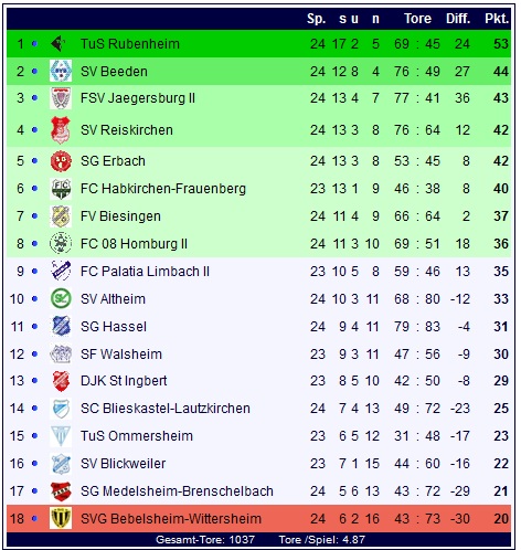 In der Tabelle übernimmt die SVG Bebelsheim-Wittersheim den letzten Tabellenplatz von der SG Medelsheim-Brenschelbach, Beeden übernimmt Rang zwei vom FSV Jägersburg II: