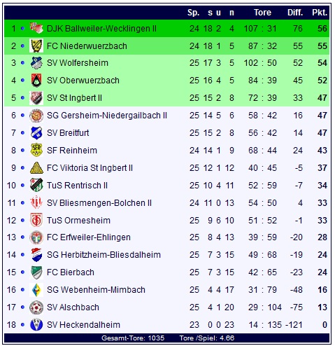 In der Tabelle bleibt die DJK-Reserve aus Ballweiler-Wecklingen vor dem FC Niederwürzbach Spitzenreiter, neuer Dritter sind die Wölfe aus Wolfersheim, die den SV Oberwürzbach hinter sich lassen und auf den derzeitigen relegationsplatz vier verdrängen:
