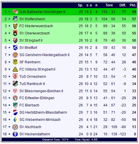 In der Tabelle behauptet die DJK Ballweiler-Wecklingen II mit einem knappen Auswärtserfolg die Spitze, dahinter schnappt sich der SV Wolfersheim den zweiten Platz und profitiert damit vom Remis des FC Niederwürzbach. Punktloses Schlusslicht bleibt weiterhin der SV Heckendalheim: