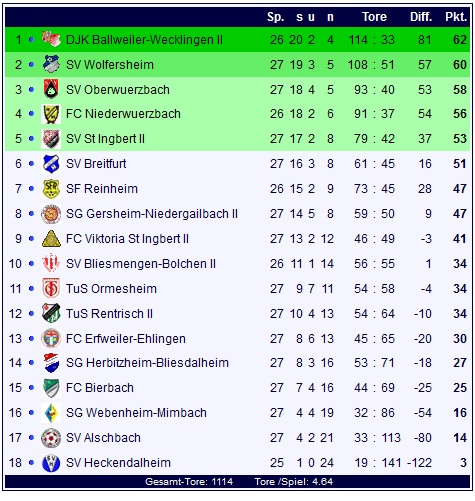 In der Tabelle sieht an der Spitze alles nach einem Vierkampf um den Titel aus, Niederwürzbach verliert durch die Heimschlappe gegen den SV St. Ingbert II auf Rang vier etwas an Boden und liegt mit einem Nachholspiel gegen die DJK im Rücken schon sechs Punkte hinter selbiger: