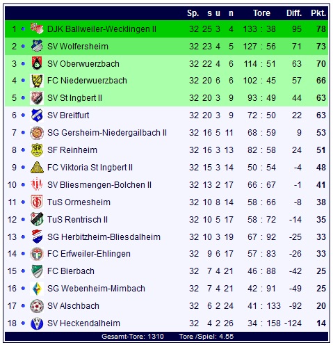 Durch den 3:2-Auswärtssieg steht die DJK Ballweiler-Wecklingen II mit 78 Punkten auf Rang eins der Tabelle und kann in der kommenden Woche mit einem Sieg aus eigener Kraft den Titel perfekt machen. Reinheim steht mit 51 Punkten auf Tabellenplatz acht.