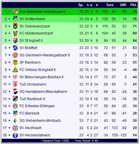 In der Tabelle stehen Ballweiler-Wecklingen II und die Wölfe als Aufsteiger fest, werden sich aber am letzten Spieltag um den Titel streiten. Somit steht ein Finale um die Aufstiegsplätze und den Titel auf dem Terminkalender der Fußballfans: