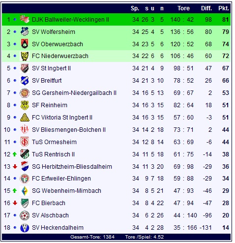 In der Tabelle ist die Situation nun klar: Ballweiler-Wecklingens Reserve ist Meister und steigt zusammen mit Wolfersheim und Oberwürzbach in die Bezirksliga Homburg auf. Niederwürzbach muss zittern und muss im Relegationsspiel gegen den Tabellenvierten der Kreisliga A Saarpfalz aus Schwarzenbach bestehen: