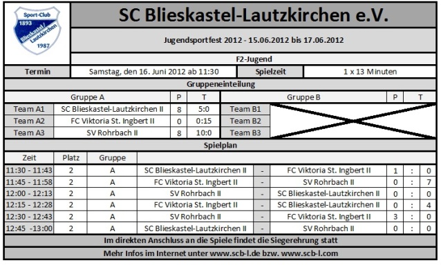 Auch drei F2-Jugenden fanden sich an der Florianstraße ein und der SC Blieskastel-Lautzkirchen II, der FC Viktoria St. Ingbert II und der SV Rohrbach II wollten in einen Dreierturnier die Podiumsplätze verteilen. Insgesamt 12 Partien standen auf dem Programm in denen am Ende der SV Rohrbach hachdünn dank des besseren Torverhältnisses vor dem SC Blieskastel-Lautzkirchen II gewann.
