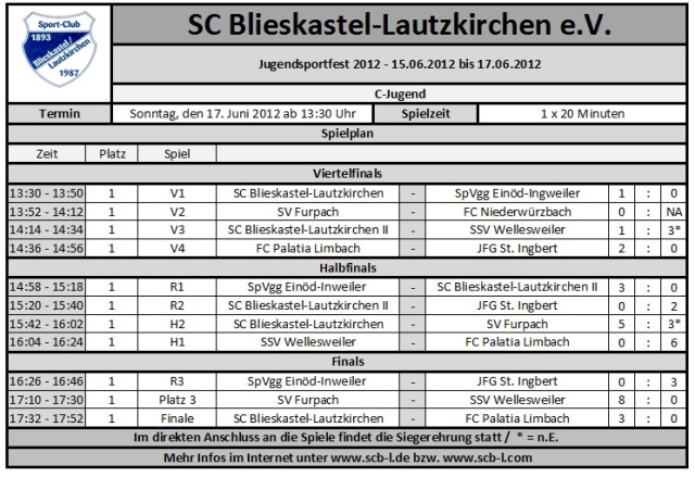 Es folgte ein C-Jugendturnier, in dem leider der FC 09 Niederwürzbach von acht C-Jugenden fehlte, dennoch gab es ein unglaublich spannendes Turnier zu sehen, in dem die Gastgeber des SC Blieskastel-Lautzkirchem, der SV Furpach, der SSV Wellesweiler und der Verbandsligist der Palatia aus Limbach in die Finalspiele einzogen, während die Spielvereinigung Einöd-Ingweiler, die JFG St. Ingbert und der SC Blieskastel-Lautzkirchen II die Plätze unter sich ausmachten. Am Ende standen sich im Finale die Palatia aus Limbach und der Gastgeber gegenüber und im fünften Aufeinandertreffen dieser Saison gewann der SC zum fünften Male souverän: Mit 3:0 fegten die Gastgeber Limbach vom Feld und schlossen das Jugendsportfest des SC im wahrsten Sinne des Wortes mit einem riesigen Knall ab!