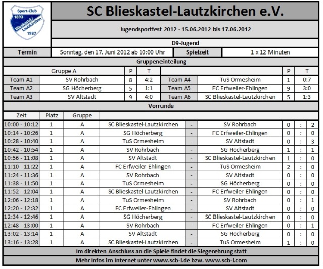 Den Anfang machten am Sonntag die D-Jugenden und davon hatte der SC gleich sechs geladen, die in einem hochklassigen 6er-Turnier ihren Meister suchten. Der SC Blieskastel-Lautzkirchen, die SG Höcherberg, der SV Altstadt, der TuS Ormesheim, der FC Erfweiler-Ehlingen und der SV Rohrbach lieferten den Zuschauern insgesamt 15 Top-Partien und am Ende wurde es mehr als nur spannend: Der SV Altstadt setzte sich mit 9 Punkten aufgrund der besseren Tordifferenz vor dem punktgleichen FC Erfweiler-Ehlingen durch, dritter wurde der SV Rohrbach vor der SG Höcherberg, dem SC Blieskastel-Lautzkirchen und dem TuS Ormesheim. Insgesamt sahen die Fußballfans hochklassigen Fußball in einem top-besetzten Turnier gepickt mit Mannschaften aus der Leistungsklasse.
