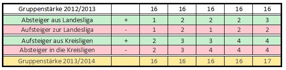 Die Zahl der Absteiger in der Landesliga hängt von drei Faktoren ab: Zum Einen von der Zahl der Verbandsliga-Absteiger, zum Anderen davon ob der eigene Tabellenzweite den Aufstieg in die jeweilige Verbandsliga realisieren kann und natürlich davon wie viele Vereine aus den Bezirksligen in die jeweilige Landesliga aufsteigen. Auch ist zu erkennen, wann die Landeligen aufgestockt würden: