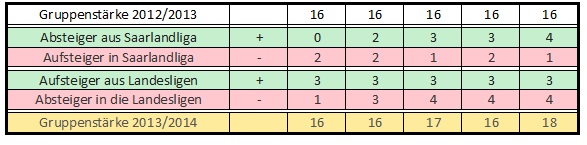 Nun gelten für die einzelnen saarländischen Spielklassen wie immer gewisse Voraussetzungen aus denen sich die Anzahl der Auf- und Absteiger unter Zuhilfenahme der Umstände in den anderen Ligen errechnen lassen, dies sind im Einzelnen:
