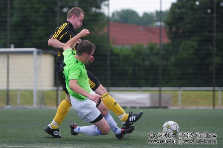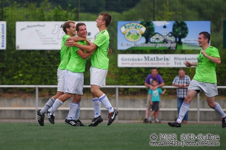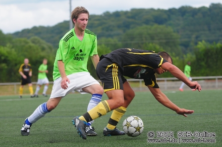 Im ersten Saisonspiel erwischte der SC Blieskastel-Lautzkirchen einen guten Start in die neue Spielzeit 2012/2013 und schon nach fünf Minuten war es Peter Pusse, der sich im Mittelfeld durchsetzen konnte und 18 Meter vor dem Tor zum Abschluss kam. SVG-Keeper Eric Lonsdorf konnte den Ball nicht festhalten und so feierte Neuzugang Benjamin Schwarz einen Einstand nach Maß, als er die Kugel über die Linie beförderte. In der Folge zeigte sich der SC engagiert und wurde belohnt, als Yannik Moschel nach 13 Minuten einen Ball mit einer schönen Direktabnahme zum 2:0 in die Maschen des SVG-Tore drosch. Der SC hatte in der Folge die Chancen die Partie frühzeitig zu entscheiden, ließ diese aber auf der Strecke. Die Partie verflachte nun mehr und mehr und auch wenn die SVG offensiv kaum gefährlich war konnte Admir Ramic mit dem Pausenpfiff eine Abstimmungsschwierigkeit in der SC-Defensive zum 2:1-Anschlusstreffer ausnutzen und mit dem Pausenstand die Partie erneut spannend machen.
