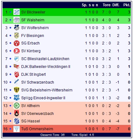 Die erste Tabelle der neuen Bezirksliga-Saison steht damit: Der erste Spitzenreiter der Saison kommt aus Blickweiler, wie schnell sich die Zeiten saisonübergreifend doch ändern können. Erstes Schlusslicht ist folgerichtig der TuS Ommersheim: