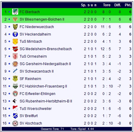 Durch den knappen Heimsieg steht die SG Gersheim-Niedergailbach II mit drei Zählern auf Rang acht der Tabelle, Ormesheim steht mit ebenfalls drei Zählern auf Rang sieben.