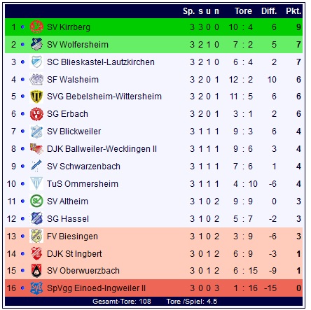 Durch den deutlichen Heimerfolg steht der SV Kirrberg als einziges Team ohne Punktverlust mit neun Punkten aus drei Spielen an der Tabellenspitze, Biesingen steht mit drei Zählern im unteren Drittel der Tabelle.