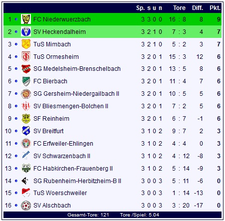 In der Tabelle der Kreisliga A Bliestal übernimmt der FC Niederwürzbach die Führung. Der SV Alschbach liefert sich zusammen mit den punktlosen Teams aus Wörschweiler und Rubenheim-Herbitzheim-Bliesdalheim einen Kampf um das Ende der Tabelle: