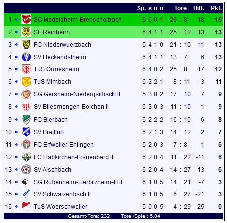 Ein Blick auf die gesammelten Ergebnisse des sechsten Spieltages zeigt erneut viele Tore, besonders sticht der 8:1-Heimerfolg der Sportfreunde aus Reinheim gegen den TuS Mimbach heraus: